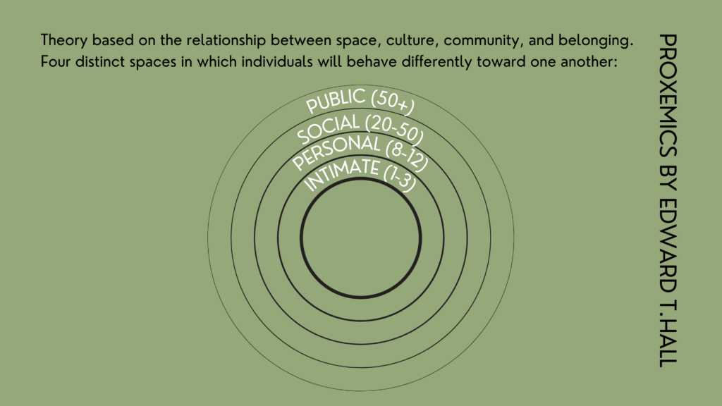 Proxemics is a theory based on the relationship between space, culture, community, and belonging. Research revealed that there are four distinct spaces in which individuals will behave differently toward one another: public, social, personal, and intimate.