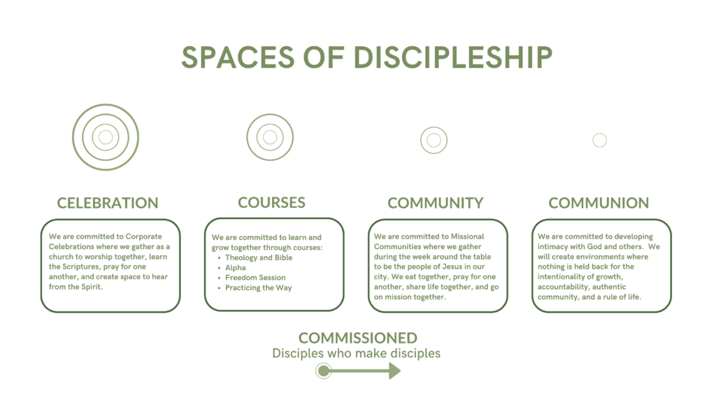 We need a discipleship strategy to fulfil the needs found in each of these social circles. Here is a basic framework for Garden City Church Spaces of Discipleship: